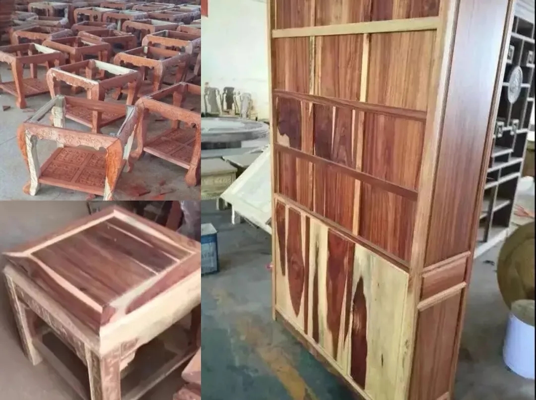 最容易摻假材質(zhì)有非洲酸枝(伯克蘇木)、木果緬茄(老撾紅木、紅花梨)、非洲紫檀(非洲花梨、紅花梨、亞花梨)、安哥拉紫檀(高棉紅 非洲緬花)。劣質(zhì)紅木家具把這幾種材質(zhì)和大果紫檀混拼,再打蠟或上漆。