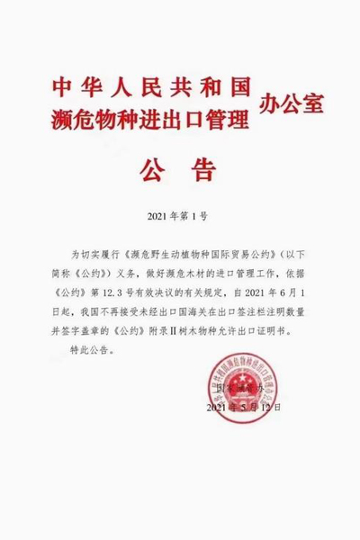 5月12日,中華人民共和國(guó)瀕危物種進(jìn)出口管理辦公室發(fā)布2021年第1號(hào)公告,自2021年6月1日起,我國(guó)不再接受未經(jīng)出口國(guó)海關(guān)在出口簽注欄注明數(shù)量并簽字蓋章的《瀕危野生動(dòng)植物種國(guó)際貿(mào)易公約》(CITES)附錄Ⅱ樹(shù)木物種允許出口證明書(shū)。此公告一出,再次引起紅木業(yè)界的關(guān)注和熱議。